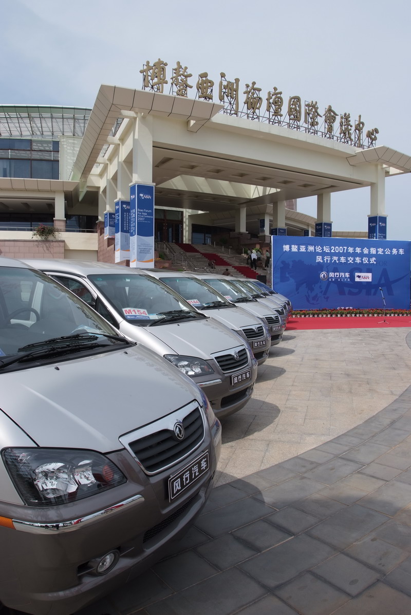 交车仪式首先由东风柳汽杨副总致词,他对众多论坛领导的出席表示了感谢,并简单介绍了风行汽车06、07年连续两次服务博鳌的合作情况。此次提供给博鳌论坛的三十辆风行汽车全部为最新上市的07款风行菱智MPV,引入了更为节能环保的三菱4G94发动机以及更加安全的四轮制动系统。最后杨副总还介绍了与博鳌同期举行的上海车展上首次亮相的“东风首款自主品牌两厢车——风行景逸”的情况,并希望明年的博鳌论坛上,景逸也可以服务于全球各界嘉宾。