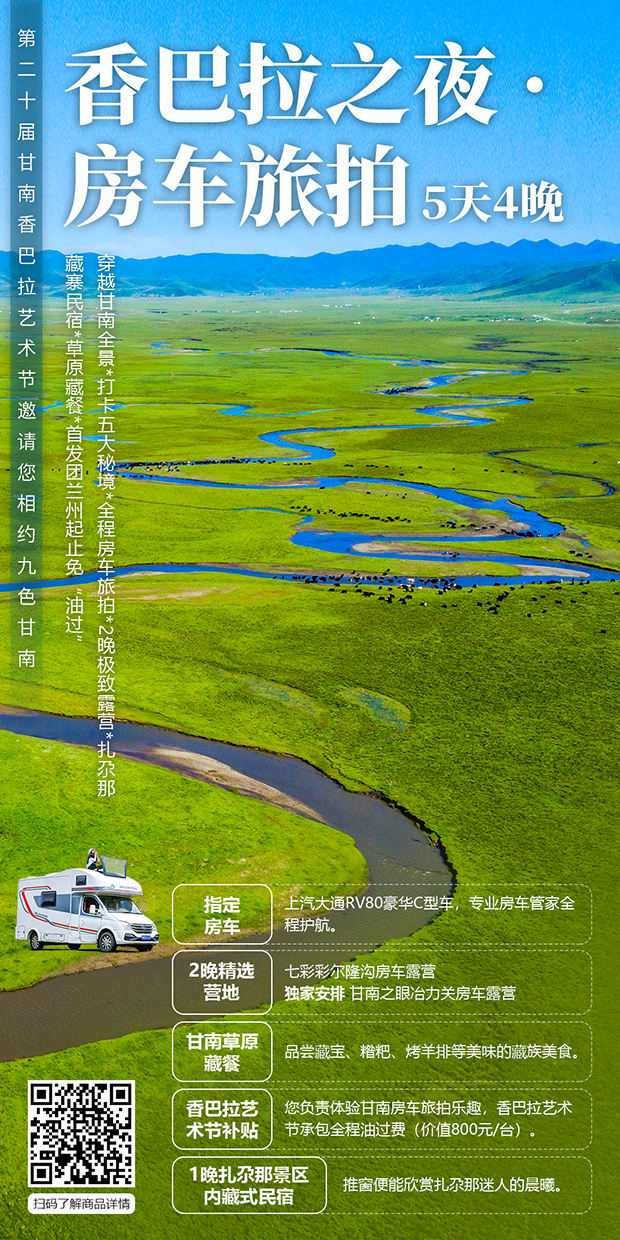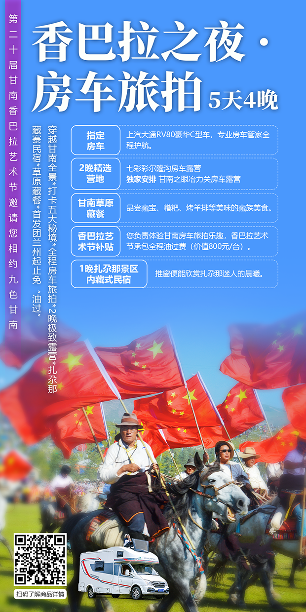 指定上汽大通RV80豪华C型车,超大空间,坐卧随意;开门是景,关门是家,全程房车管家悉心护航。您负责体验甘南房车旅拍乐趣,香巴拉艺术节承包全程油过费(价值800元/台)