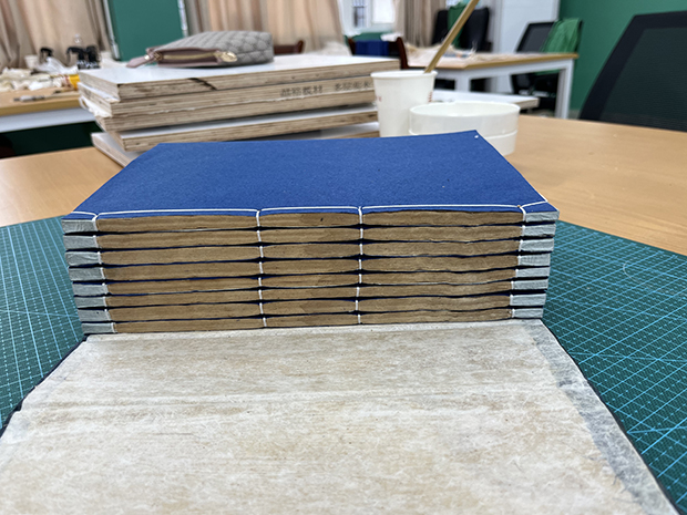 此次培训由古籍修复专家、国家级古籍修复技艺传习所导师杨利群老师授课,为学员提供了极其难得的学习机会。杨利群导师为学员进行耐心细致的技艺传授,从选纸选材讲起,一步步教大家在实践课上,完成了裁纸、折叶、压平、纸捻制作、四眼线装书制作的了解和制作。学员们热情高涨,致力在培训班期间提升自己的技艺,抓住每一个机会向杨老师、各组长请教,加班加点、废寝忘食的进行书叶修复实践。通过理论联系实践、导师亲临指导,学员技艺提高神速,精彩习作纷呈。