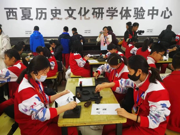 学生们走进遗址区,近距离观摩陵塔建筑夯土结构,了解历史的沧桑巨变,感受穿越千年的历史人文魅力。在西夏陵博物馆,鎏金铜牛、迦陵频伽雕龙栏柱、琉璃鸱吻……一件件珍贵文物背后的历史故事让学生震撼。除了3D主题电影《西夏情缘》、4D主题奇幻电影《西夏地宫奇幻之旅》,木活字印刷体验等常规游学内容外,景区还设计了“我在西夏博物馆修文物”“贺兰石雕刻”“访文物 知家乡”“指尖生花—衍纸画”“非遗扎染体验”“博物馆写生”等多个主题形式的研学课程,力求研学体验更有深度,更有吸引力。